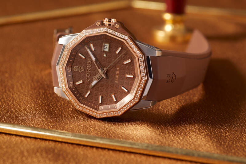 全新上市的海军上将38女皇系列自动腕表,传承系列标志性的12边形表壳,招牌的旗语时标则以线图形式呈现,设置在倾斜的表圈内侧,对应面盘上的棒状时标。其中非常亮眼的咖啡色和白色,结合表盘上的"石榴裂纹"(Grenadier Fendu) ,即刻联想到芳香可口的"巧克力排"。表圈还镶嵌了72枚明亮式切割钻石,火光熠熠,闪耀动人。