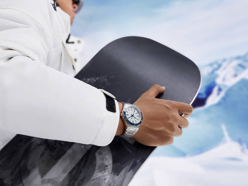 一气呵成飞跃雪地,潇洒完成停驻动作,在"冰雪奇想"限量腕表同样得到"浑然一体"的印证。飞亚达从滑雪目镜汲取几何线条灵感,首次为极限系列配备棱面钢带,表带链节以硬朗线条呼应表壳,经历多道光砂复合打磨工艺,表带服贴手腕曲线,以精钢铸就的按制表扣,更显运动风格。
