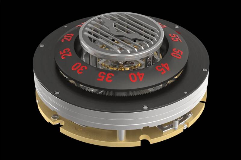 腕表对小时和分钟采用不同的读时方式。时针固定在围绕陀飞轮360°旋转的外圈显示装置上。分钟以圆盘显示,每小时转动一周。球形切割蓝宝石水晶呈弧形低调覆盖于表盘上方,巧妙映衬45毫米黑色DLC涂层5级钛金属表壳的圆润边缘。机芯和手表组件总共283个零件,每个零件均由位于瑞士格朗(Gland)小镇的Kross Studio内部进行手工制作和组装。
