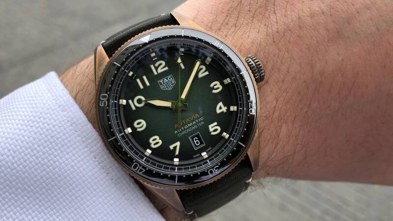 这是一只泰格豪雅TAG HEUER AUTAVIA系列WBE5190.FC8268腕表,这只腕表搭载自动机械机芯,且机芯经过瑞士天文台认证,表壳为青铜材质,小牛皮表带,具有日期显示功能,表径42毫米,防水100米,参考价格28500元(以实际价格为准)。