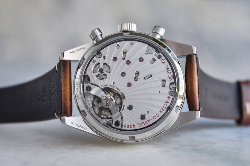 通过透底表背,我们便可以看到填满了整个表壳内部空间的新机芯--Cal.9906。之前有关注过欧米茄板块的朋友们或许会觉得有些眼熟,很正常,因为该机芯的架构与近来推出的Chronoscope表款所使用的机芯是相同的。它们之间唯一的不同就是出现了日期功能。它依然有着硕大的3/4夹板,上面使用放射状条纹进行了修饰。其余参数也是与之前一样,包括导柱轮和垂直离合计时机制,可提供60小时稳定动力的双串联发条盒,以及4Hz的摆频。