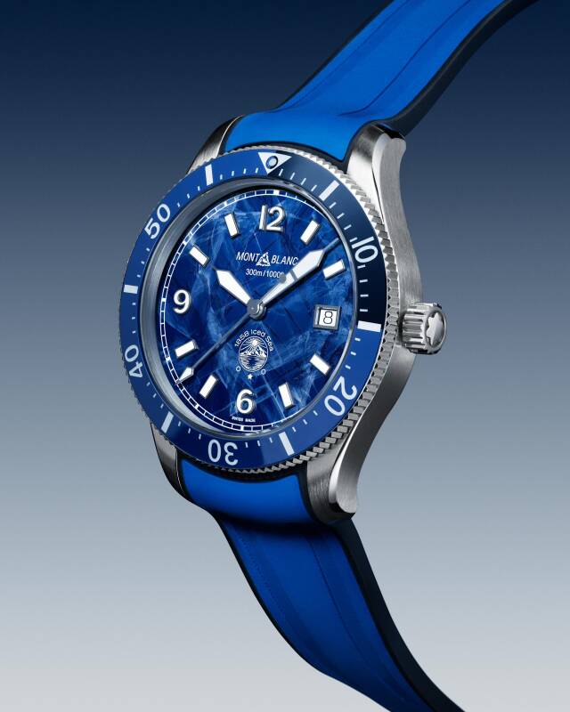 全新万宝龙1858系列潜水腕表是品牌推出的首款潜水腕表,并通过ISO6425标准认证。腕表搭配独特的"冰川纹"表盘,生动展现冻结了数千年之久的冰川冰所形成的纹理和质感。万宝龙制表师采用了一种特殊的制作工艺"gratté boisé"来制作表盘,以呈现出逼真的冰川深邃感。每当佩戴者看向表盘时,仿佛正穿越冰层、潜入冰川水域、身临其境地探索自然之美。