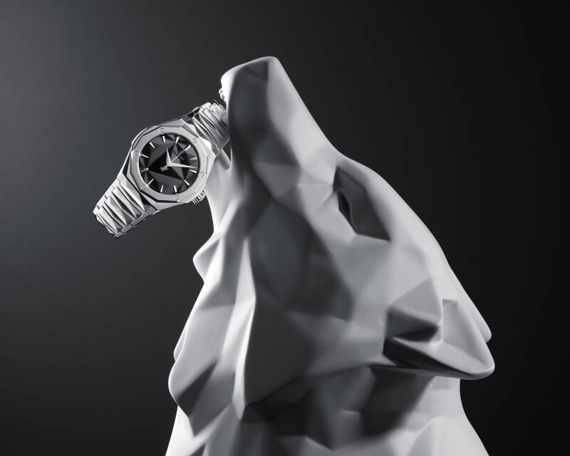 如今,宇舶表与奥林斯基耀目推出四款配备全新一体式金属表链的经典融合奥林斯基表链腕表,标志着双方合作正式迈入全新阶段。众所周知,一体式表链的设计是制表业长期面临的一项艰巨挑战,因为表链须在机械与美学层面高度契合表壳的设计,且须能够与任意腕表款型相匹配。为此,宇舶表制表团队以匠心精神和精湛技艺打造时计臻品,运用专业技术打磨棱角、斜面和多角度切面,以赋予表壳、倒角设计和表冠鲜明的特色。同时,工程师们还精心打造了一款融合斜面和多面元素的钛金属表链,由83个部件组成。表链的设计灵感源自奥林斯基的雕塑作品,其倒角形状与镜面抛光刻面所反射的光线相得益彰,而H形链节也与宇舶表的"H"形标志相呼应。