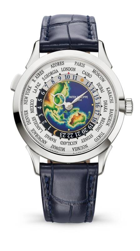 自路易·柯蒂耶(Louis Cottier)于 1930 年代发明世界时间装置以来,百达翡丽著名的世界时间腕表常 以大明火掐丝珐琅世界地图装饰表盘。2022 年,百达翡丽发布全新白金表款,以大明火掐丝珐琅表盘礼 赞东南亚与大洋洲的蓬勃活力。为糅合地图之美和浪漫诗意,工匠必须先用纤细的金线勾勒出陆地和岛 屿的轮廓,接着再用各种颜色的珐琅填入这些金线围成的区域,再现海洋和陆地的样貌,其间必须将涂 覆珐琅的表盘底板多次放入高温窑炉中烧制。