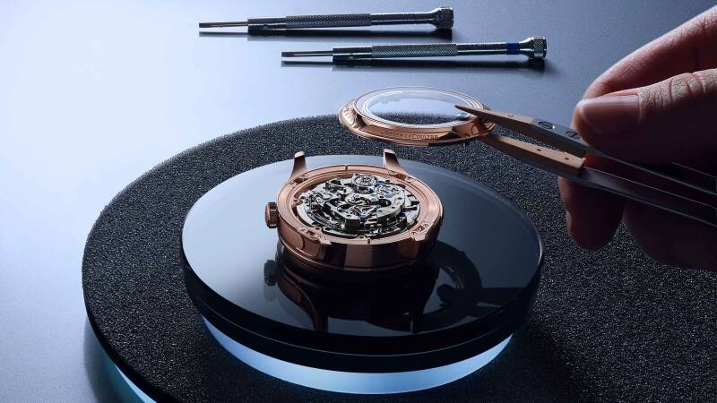 表壳玫瑰金或白金表壳,微喷、缎面打磨和抛光润饰;蓝宝石水晶底盖