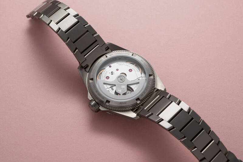 翻转腕表,来到背面。全新PPX 400自主机芯 腕表的底盖材质也为钛合金,人工合成蓝宝石透底,可以清楚看到底盖下,豪利时独家的五天动力储存自主机芯--Oris 400。