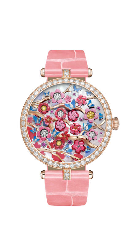 每个表盘由不少于226个装饰元素构成,花瓣及蝴蝶以微绘呈现,枝干则由刻面黄K金精铸,加上白色珍珠母贝云絮和细工镶嵌的黄色及白色钻石, 彰显日内瓦制表工坊的手工造诣。金 质表底盖镌刻了优美图案,以呼应表 盘上的满园春色;而机芯摆轮饰有玑镂雕花与微绘珐琅的蜻蜓或蝴蝶,在蓝宝石水晶玻璃表镜下一览无遗。 时间悠悠地拍动翅膀,在大自然的韵律指挥下,在Van Cleef & Arpels梵克雅宝的花园中翩翩飞舞。