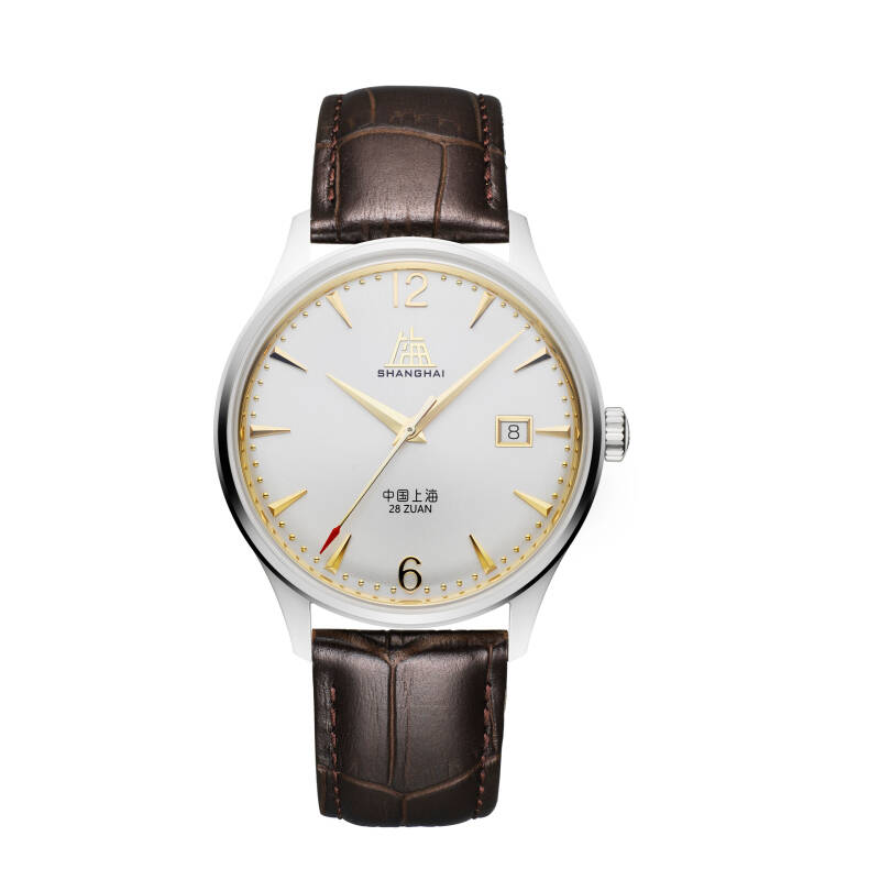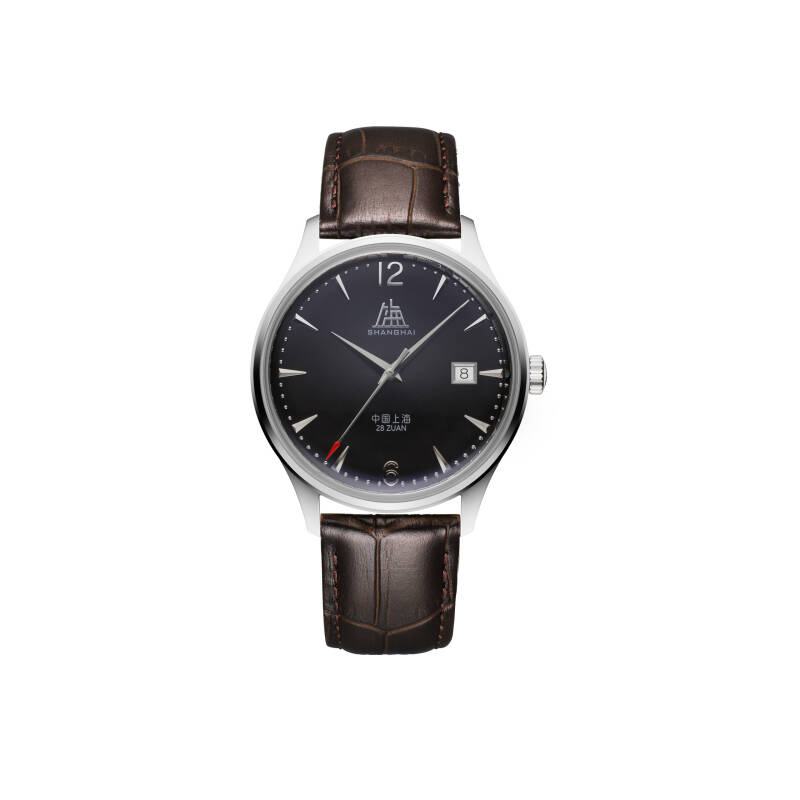表盘上同样引人瞩目的,是12点刻度下方的「大厦体」Logo。呈下宽上窄等三角形结构的「大厦体」Logo作为品牌初始Logo,灵感来源兼具先锋理念与摩登审美的外滩经典建筑--上海大厦,蕴含品牌自强不息、傲然崛起的内涵,是上海表匠心品质的又一象征,完美复刻当年韵味,也衬托出佩戴者高雅深邃、端庄绅士的魅力。
