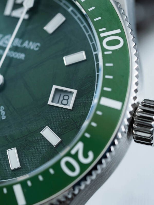 远山绿的配色的确与劳力士绿水鬼神似。这也不奇怪,它采用的就是一个现代标准潜水表的外观设计,圆形表壳,单向表圈,大号时标和指针,再配上这个绿色,一打眼,很多人都会把它误看成"绿水鬼"。但只要走近它,就会发现它与绿水鬼之间有许多不同之处,其中还包括万宝龙独一无二的创意!