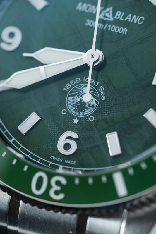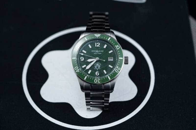 近几年,万宝龙在腕表品类上持续发力,今年日内瓦表展上带给我们最大的惊喜,就是推出了首款万宝龙1858系列潜水腕表,一共有三个配色,冰川蓝,玄岩黑还有我手里拿的这块远山绿。