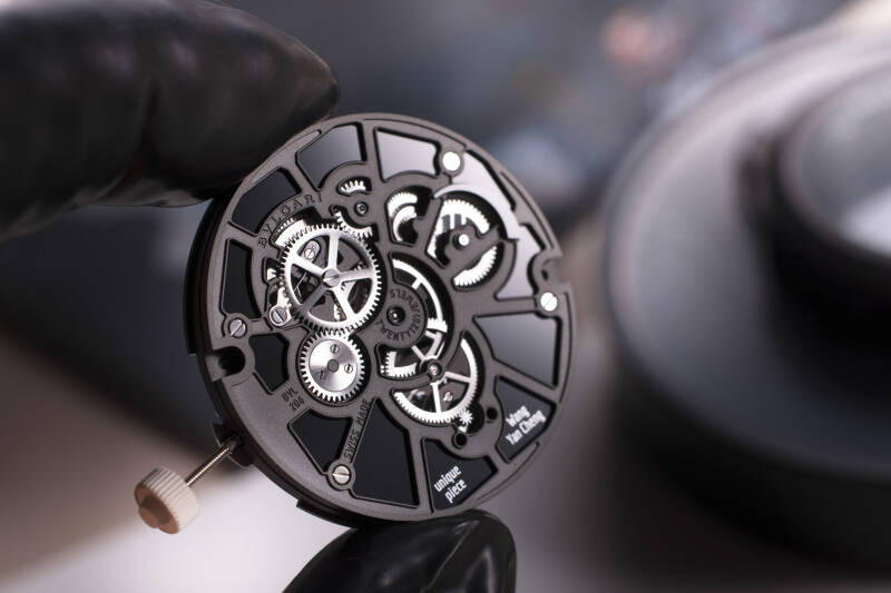 8件等比例缩小的艺术作品基于机芯的轮廓线条经过精心分割,得以无缝嵌入尺寸仅31.5×31.5毫米的BVL 206机芯。每一枚Octo Roma Naturalia x王衍成系列腕表的表背也必须呈现出缟玛瑙所固有的纯黑特质。细致入微的精湛工艺成就的是8件魅力独具的真正艺术品。承载这些作品的"画布"巧妙隐藏于时计内部,不仅传递缟玛瑙本身的自然灵性,还诠释着多元化创作的可能性,因而更显华美珍贵。