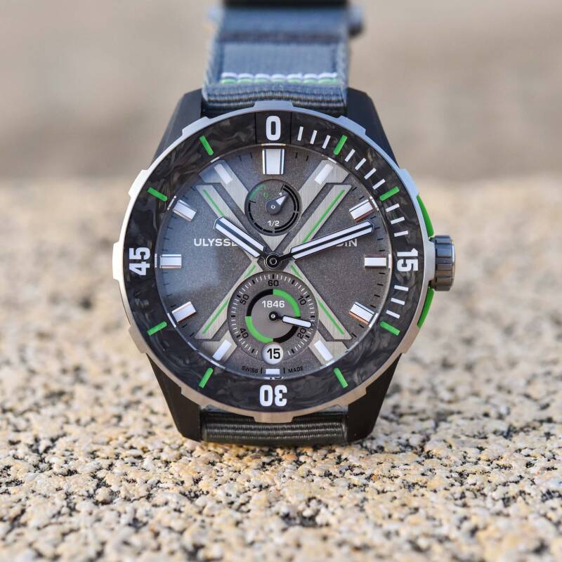 新作的表盘采用了与之前的Diver Net概念表相同的基本设计,但其外观的表现力已变得更强。总的来说,它的颜色更深,有了更多的纹理修饰。x形图案依然存在,其带有绿色对比线并经垂直拉丝工艺进行了处理。镶贴时标连同所有指针在内,都被涂覆了足量的Super-LumiNova夜光材质,确保了低光环境下的可读性。超大的中央指针指示小时和分钟,位于6点位的是小秒盘和日历窗的结合体,而12点位放置的则是动力储备指示模块。