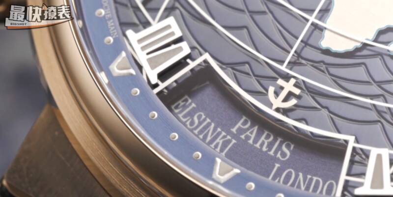 除了世界时功能,外观方面也是可圈可点。相信大家已经注意到了,这款表的表盘为一个倾斜的地球仪造型,并且层次感分明。实际上它由三部分组成,以玑镂工艺雕刻出海浪纹理的蓝色底版,绘有银色大陆图案以及经纬线的蓝宝石水晶镜面,以及蓝色的分钟刻度环。