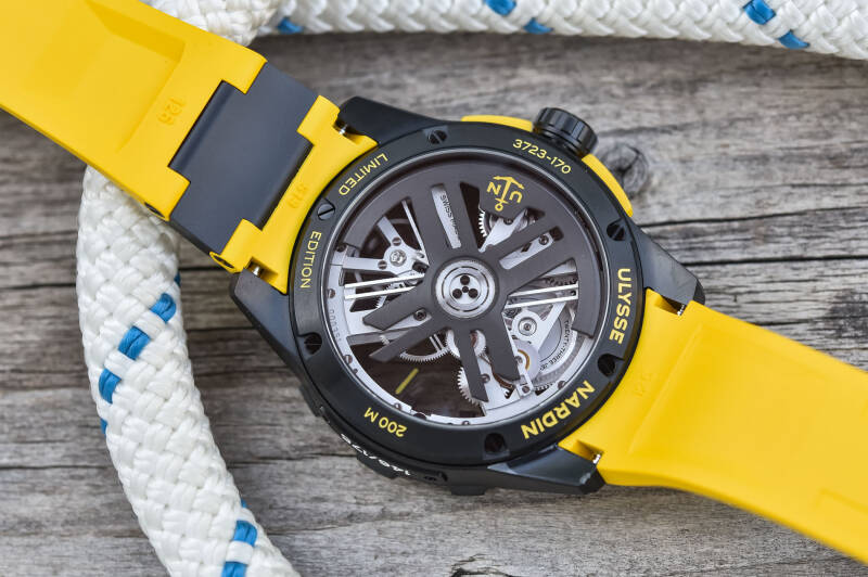 与尺寸达44mm x 16mm的大块头体格相反,这款表十分的轻盈,因为它是由钛合金材质打造而成的。其表面经黑色DLC涂层进行了处理,表壳侧面经由喷砂打磨,搭配缎面抛光表耳,整体看起来粗犷不乏精致。为了凸显其运动潜水腕表的吸引力,在表冠的两侧设置有亮黄色的橡胶护肩,用以保护表冠免受意外磕碰,进而确保200米防水性能的可靠性。