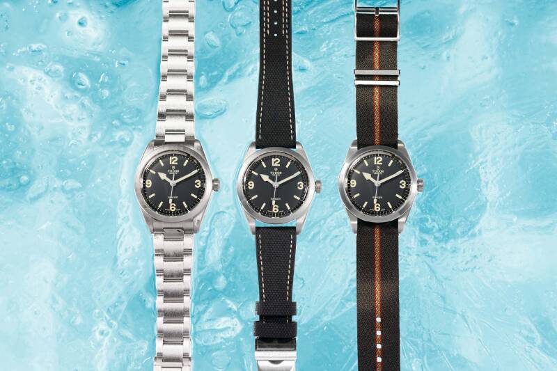 三款表带设计可选:饰有红色及米色条纹的橄榄绿色提花织纹表带、皮胶复合表带或316L钢表带,搭配帝舵表"T-fit"带扣,便于快速调节